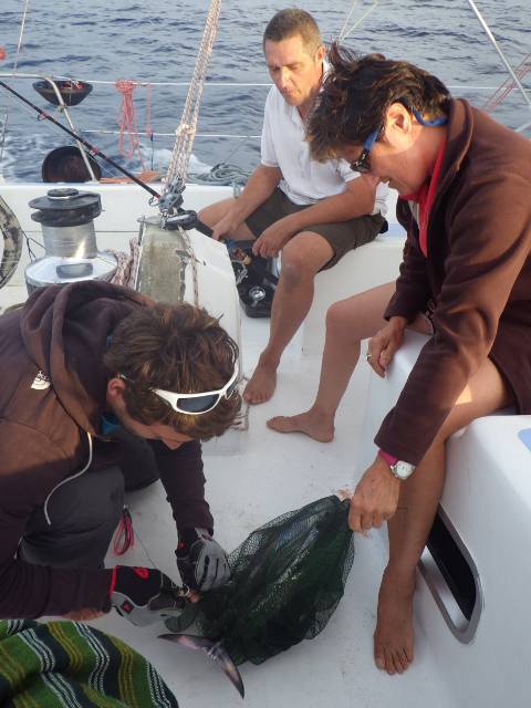 Notre nouvel équipier, Paul, a embarqué avec, dans son sac, bocaux de foie gras et de giroles et 2 bérets basques (pas en laine des Pyrénées, pas en chocolat de chez Miremont, mais en bon cochon). Avec aussi des talents de pêcheur et leur mise en application n’a pas tardée.
